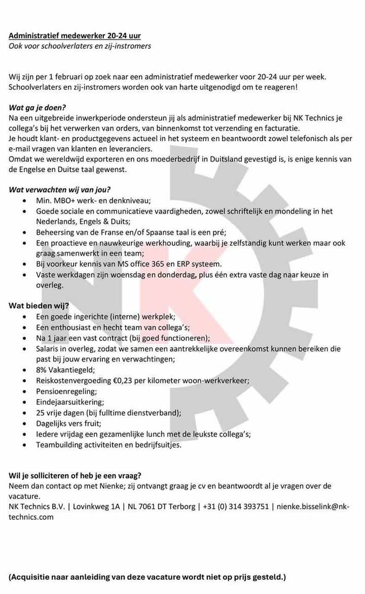 Word administratief medewerker (20-24 uur) bij NK Technics BV in Terborg!